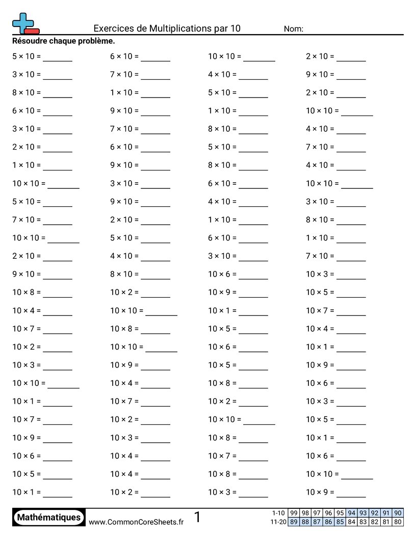 Fiches gratuites de math sur Exercices de Multiplications par 10. Chaque fiche contient 100 exercices avec corrigé et convient aux enseignants et à l'enseignement à domicile. Vous pouvez télécharger le PDF, créer des cartes mémoire ou l'utiliser pour l'apprentissage en ligne.