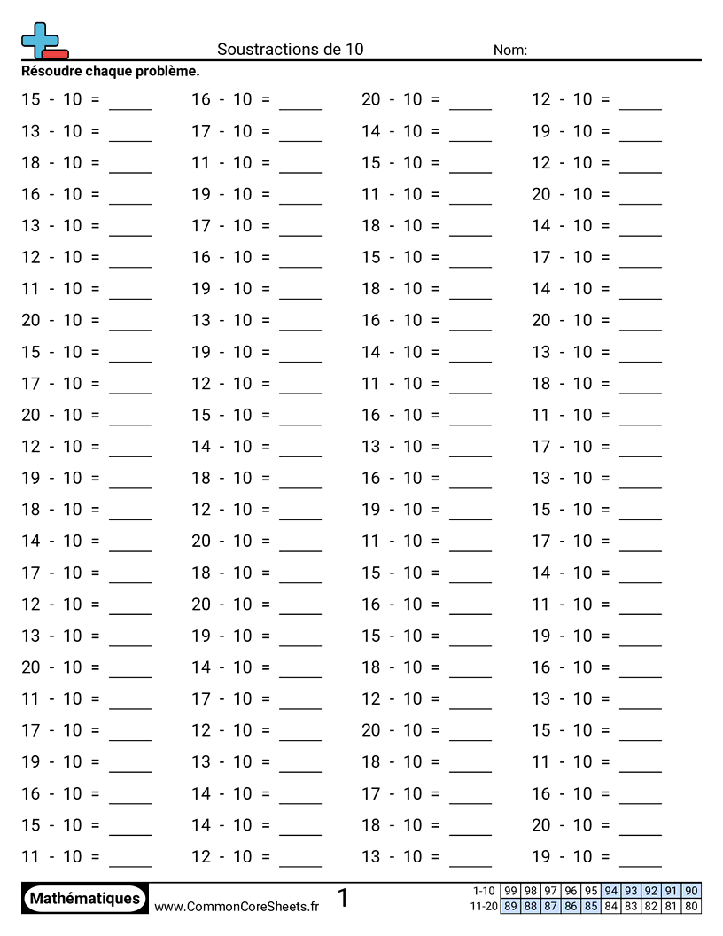 Fiches gratuites de math sur Soustractions de 10. Chaque fiche contient 100 exercices avec corrigé et convient aux enseignants et à l'enseignement à domicile. Vous pouvez télécharger le PDF, créer des cartes mémoire ou l'utiliser pour l'apprentissage en ligne.