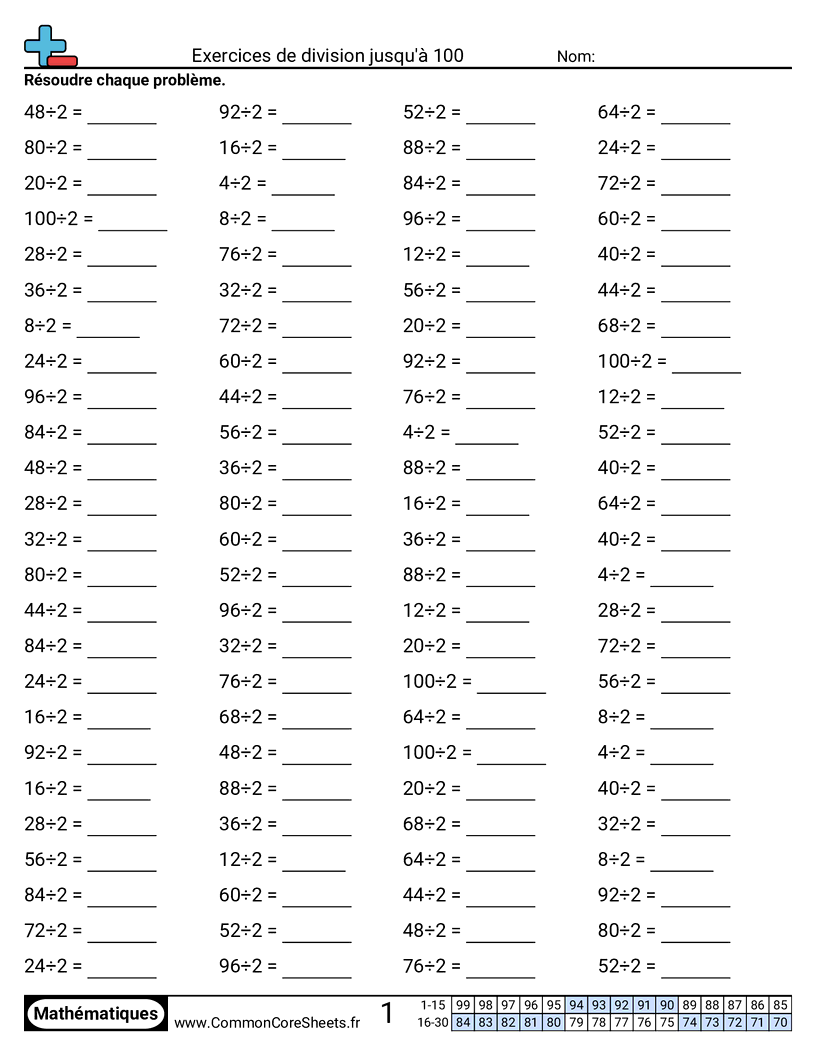 Fiches gratuites de math sur Exercices de division jusqu'à 100. Chaque fiche contient 100 exercices avec corrigé et convient aux enseignants et à l'enseignement à domicile. Vous pouvez télécharger le PDF, créer des cartes mémoire ou l'utiliser pour l'apprentissage en ligne.