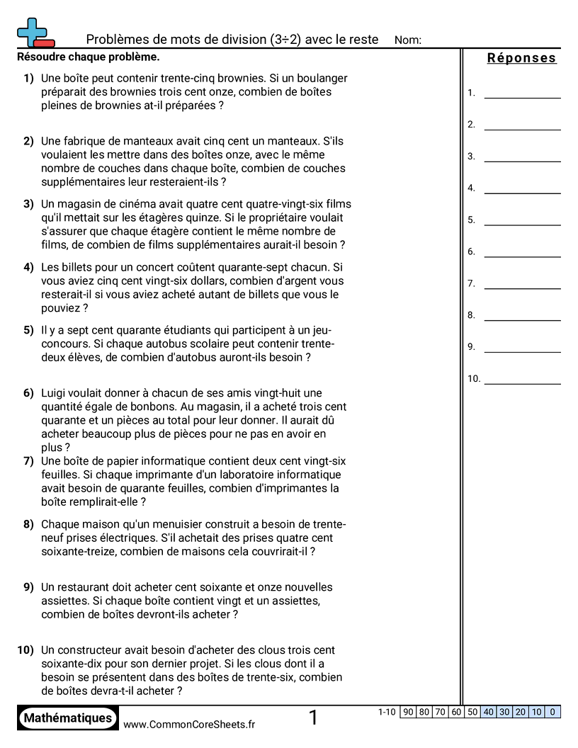 Fiches gratuites de math pour CM2 (5nbt6) sur Problèmes de mots de division (3÷2) avec le reste. Chaque fiche contient 10 exercices avec corrigé et convient aux enseignants et à l'enseignement à domicile. Vous pouvez télécharger le PDF, créer des cartes mémoire ou l'utiliser pour l'apprentissage en ligne.