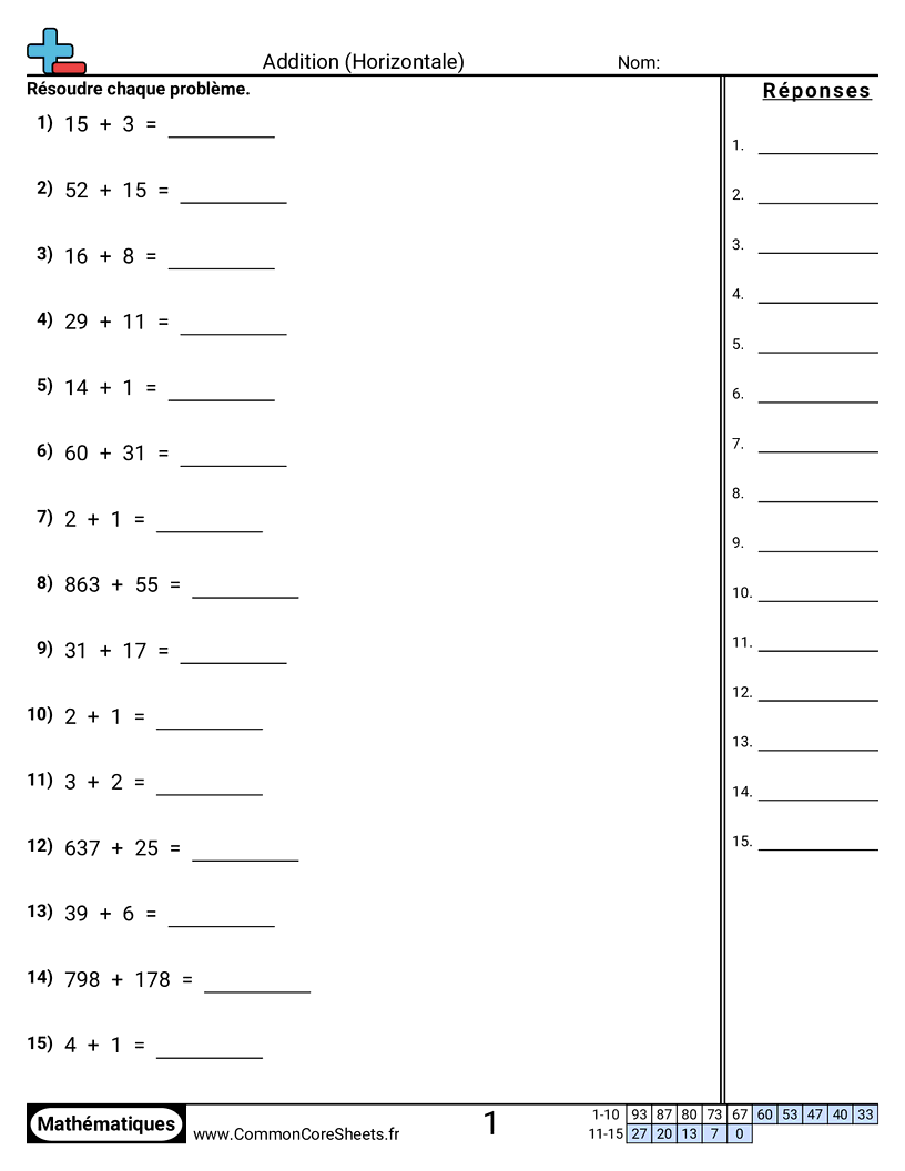 Fiches gratuites de math sur Addition (Horizontale). Chaque fiche contient 15 exercices avec corrigé et convient aux enseignants et à l'enseignement à domicile. Vous pouvez télécharger le PDF, créer des cartes mémoire ou l'utiliser pour l'apprentissage en ligne.