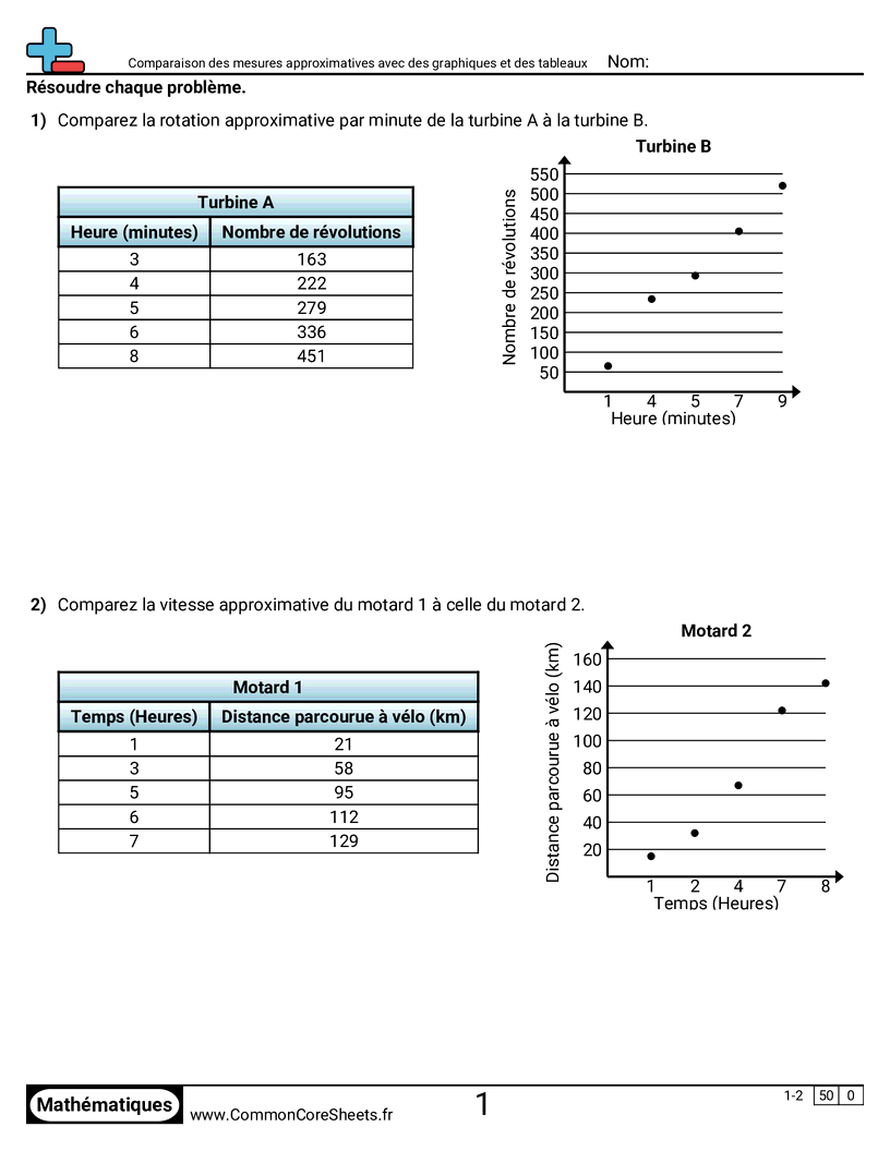 Fiches gratuites de math pour 4ème (8ee5) sur Comparaison des mesures approximatives avec des graphiques et des tableaux. Chaque fiche contient 2 exercices avec corrigé et convient aux enseignants et à l'enseignement à domicile. Vous pouvez télécharger le PDF, créer des cartes mémoire ou l'utiliser pour l'apprentissage en ligne.