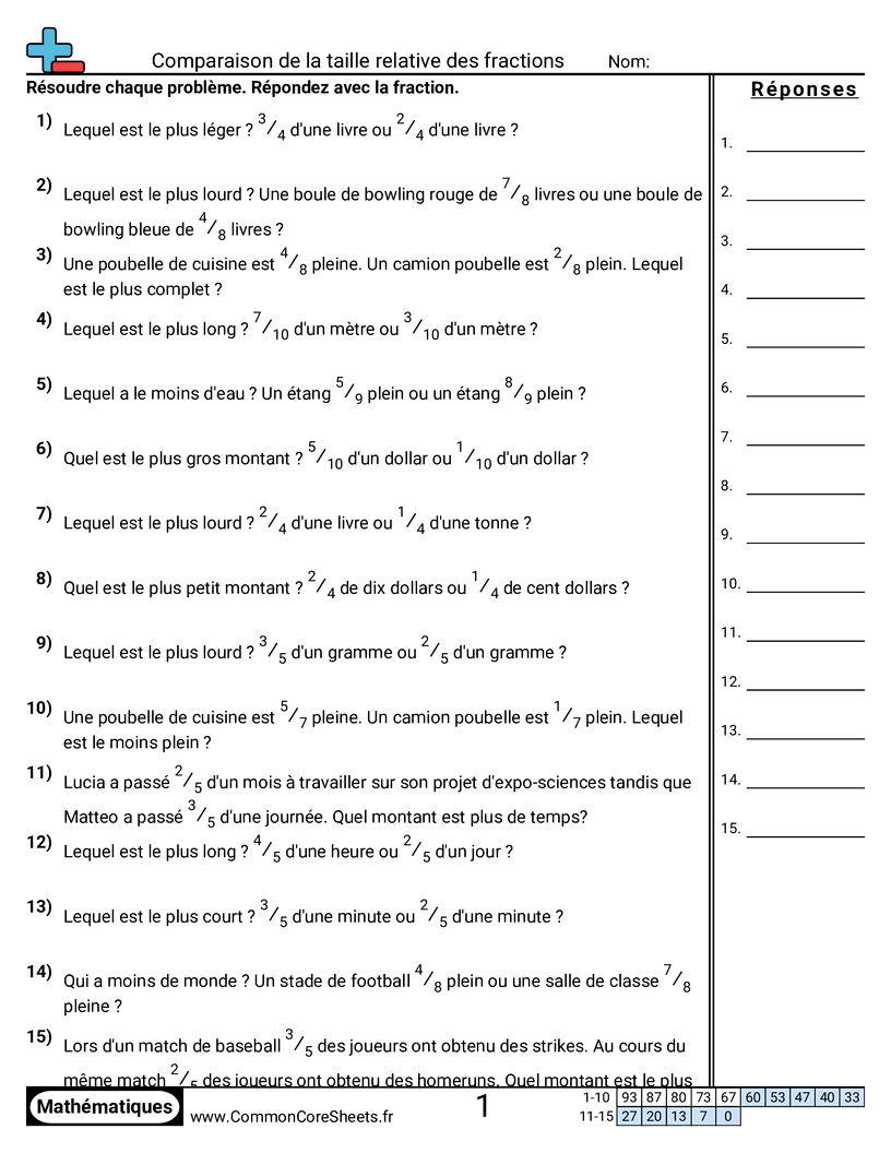 Fiches gratuites de math sur Comparaison de la taille relative des fractions . Chaque fiche contient 15 exercices avec corrigé et convient aux enseignants et à l'enseignement à domicile. Vous pouvez télécharger le PDF, créer des cartes mémoire ou l'utiliser pour l'apprentissage en ligne.