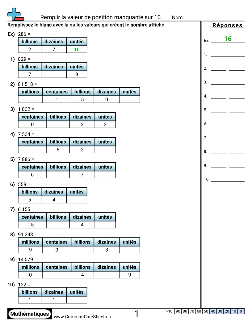 Fiches gratuites de math pour CM1 (4nbt1) sur Remplir la valeur de position manquante sur 10.. Chaque fiche contient 10 exercices avec corrigé et convient aux enseignants et à l'enseignement à domicile. Vous pouvez télécharger le PDF, créer des cartes mémoire ou l'utiliser pour l'apprentissage en ligne.