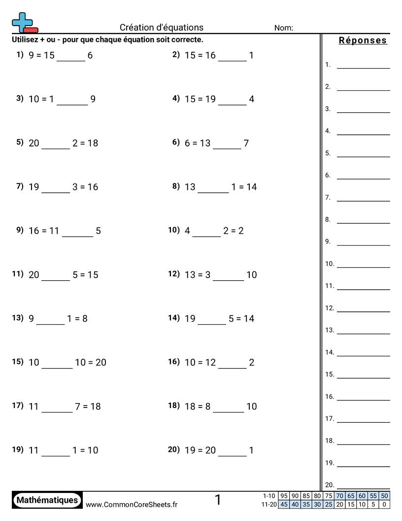 Fiches gratuites de math sur Création d'équations. Chaque fiche contient 20 exercices avec corrigé et convient aux enseignants et à l'enseignement à domicile. Vous pouvez télécharger le PDF, créer des cartes mémoire ou l'utiliser pour l'apprentissage en ligne.