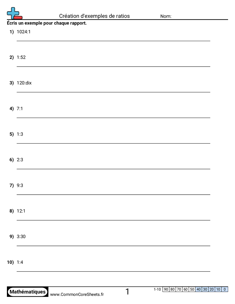 Fiches gratuites de math pour 6ème (6rp1) sur Création d'exemples de ratios. Chaque fiche contient 10 exercices avec corrigé et convient aux enseignants et à l'enseignement à domicile. Vous pouvez télécharger le PDF, créer des cartes mémoire ou l'utiliser pour l'apprentissage en ligne.