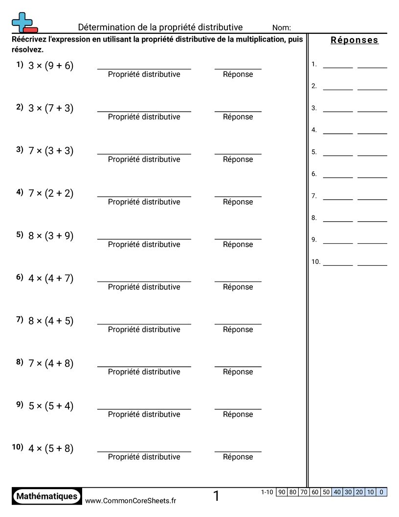 Fiches gratuites de math sur Détermination de la propriété distributive. Chaque fiche contient 10 exercices avec corrigé et convient aux enseignants et à l'enseignement à domicile. Vous pouvez télécharger le PDF, créer des cartes mémoire ou l'utiliser pour l'apprentissage en ligne.