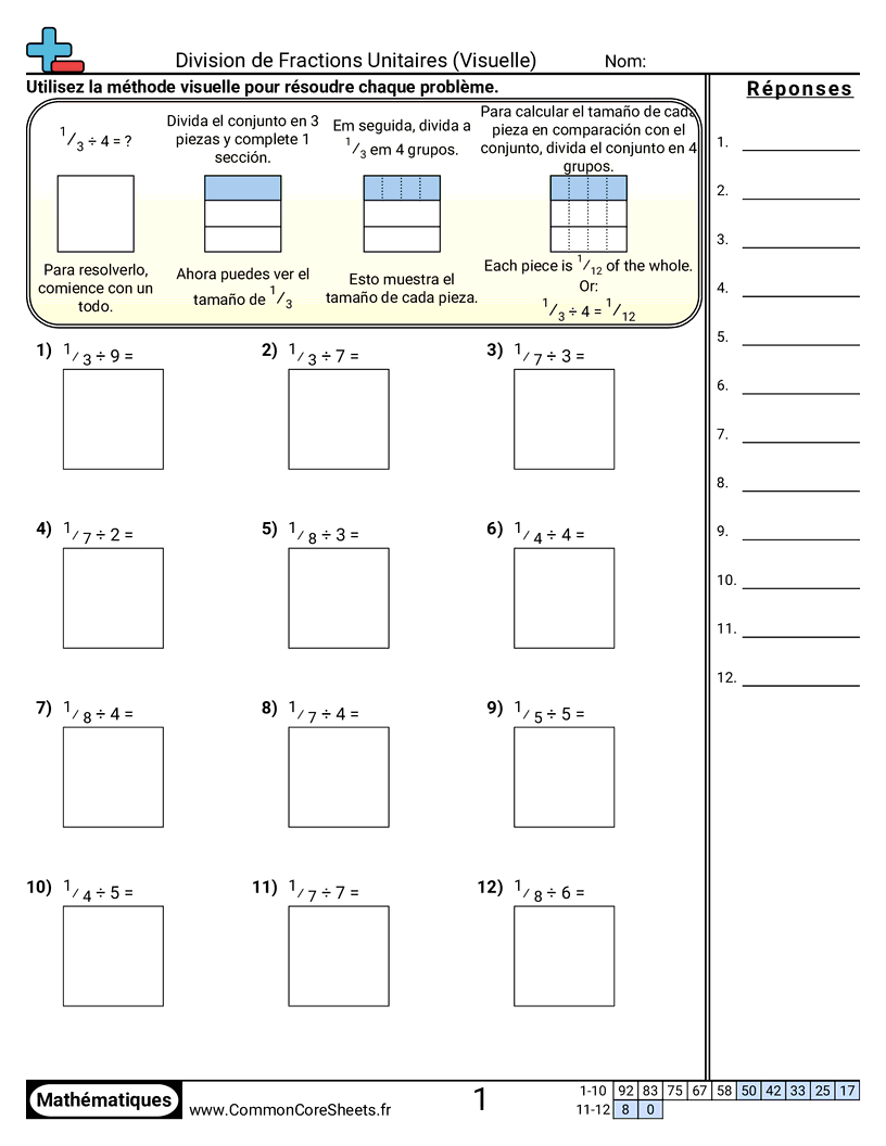 Fiches gratuites de math pour CM2 (5nf7a) sur Division de Fractions Unitaires (Visuelle). Chaque fiche contient 12 exercices avec corrigé et convient aux enseignants et à l'enseignement à domicile. Vous pouvez télécharger le PDF, créer des cartes mémoire ou l'utiliser pour l'apprentissage en ligne.