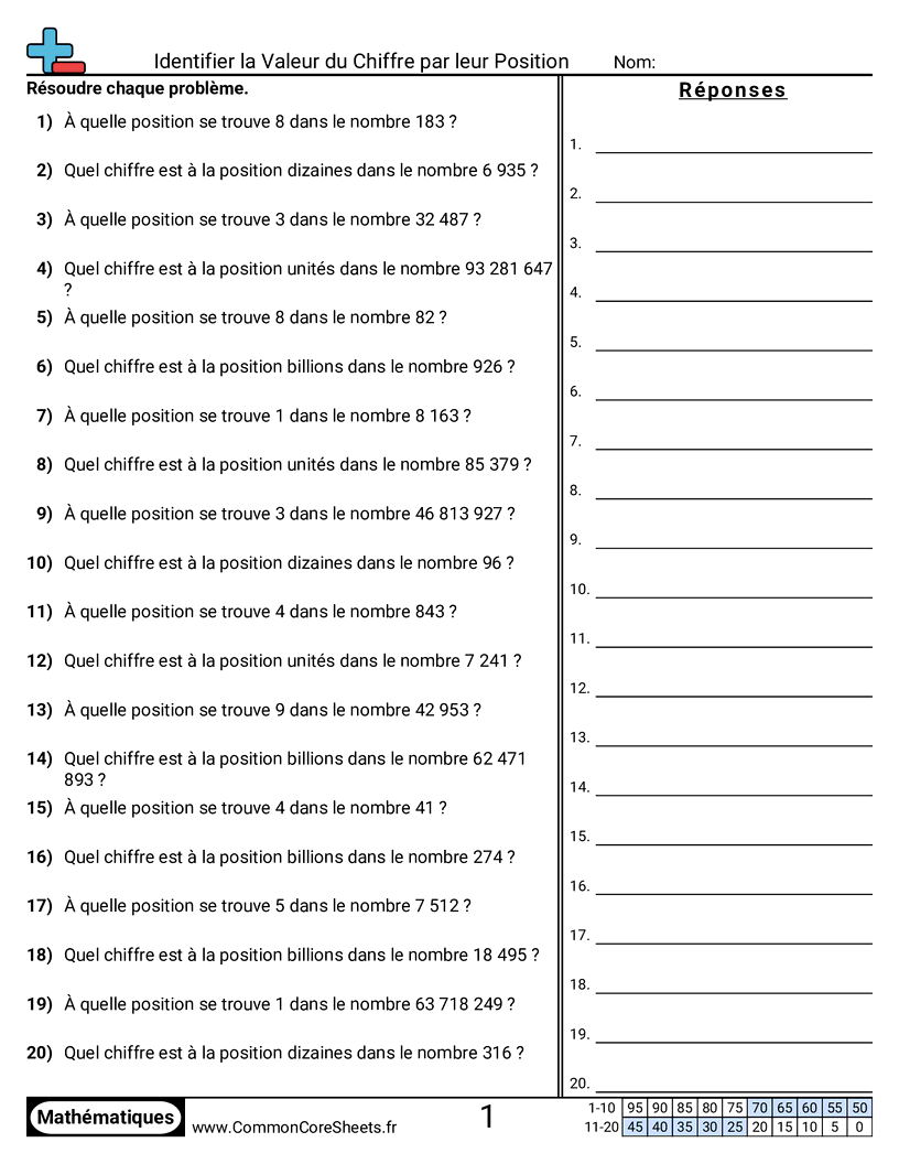 Fiches gratuites de math sur Identifier la Valeur du Chiffre par leur Position. Chaque fiche contient 20 exercices avec corrigé et convient aux enseignants et à l'enseignement à domicile. Vous pouvez télécharger le PDF, créer des cartes mémoire ou l'utiliser pour l'apprentissage en ligne.