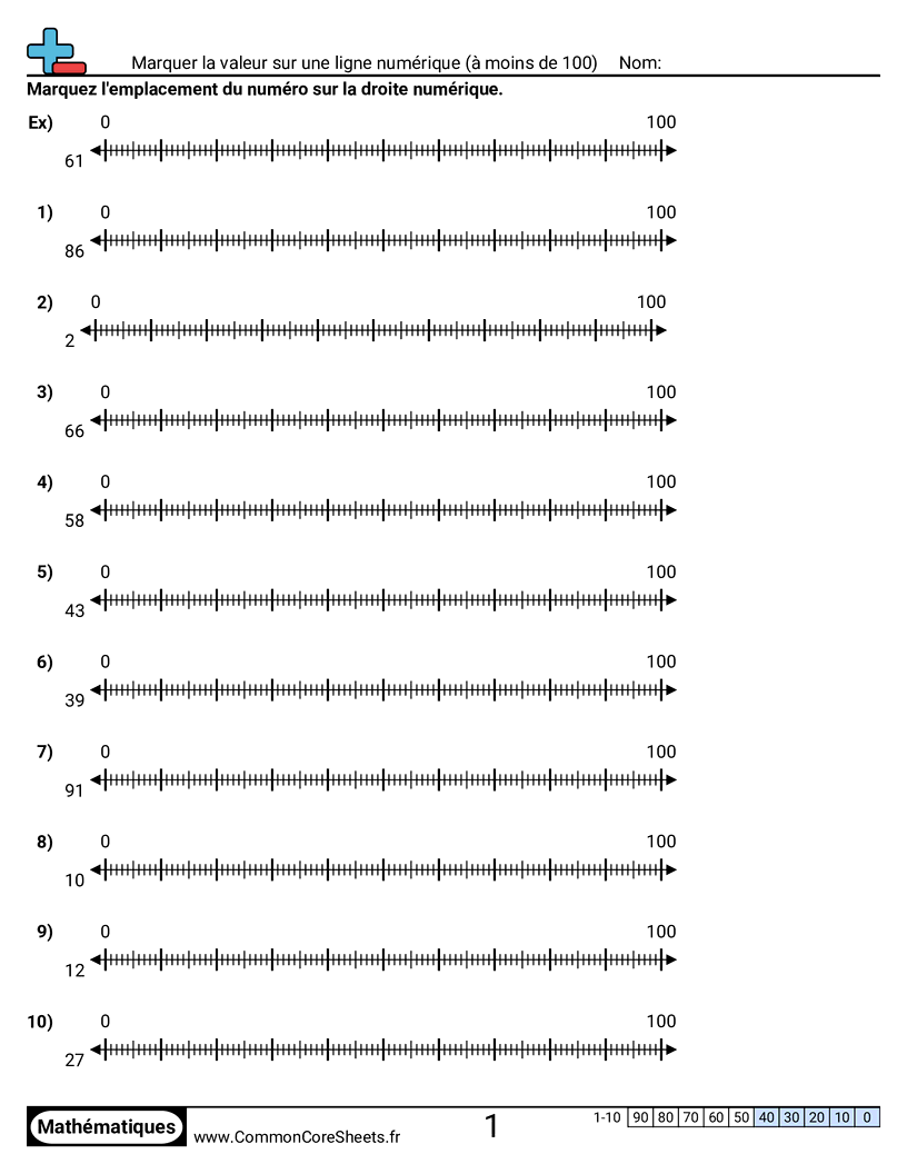 Fiches gratuites de math sur Marquer la valeur sur une ligne numérique (à moins de 100). Chaque fiche contient 10 exercices avec corrigé et convient aux enseignants et à l'enseignement à domicile. Vous pouvez télécharger le PDF, créer des cartes mémoire ou l'utiliser pour l'apprentissage en ligne.