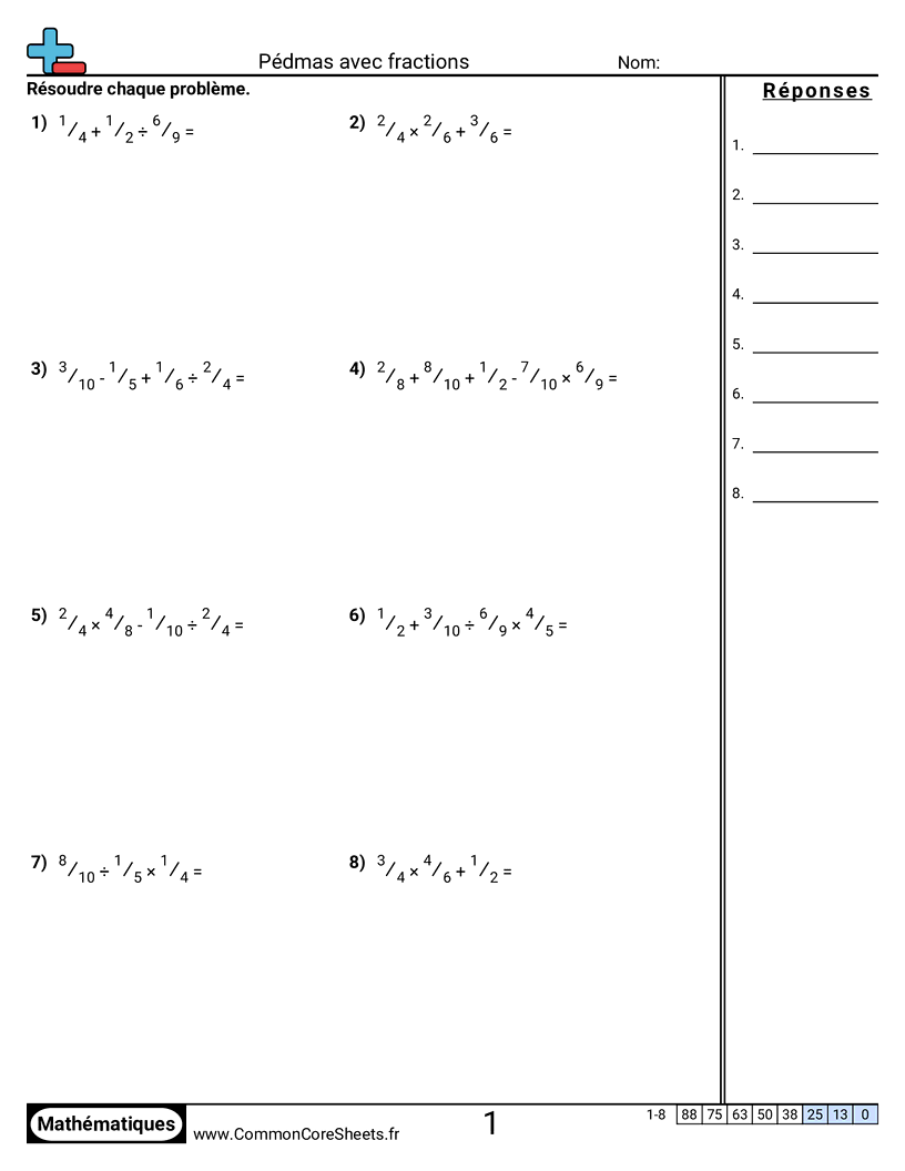 Fiches gratuites de math sur Pédmas avec fractions. Chaque fiche contient 8 exercices avec corrigé et convient aux enseignants et à l'enseignement à domicile. Vous pouvez télécharger le PDF, créer des cartes mémoire ou l'utiliser pour l'apprentissage en ligne.
