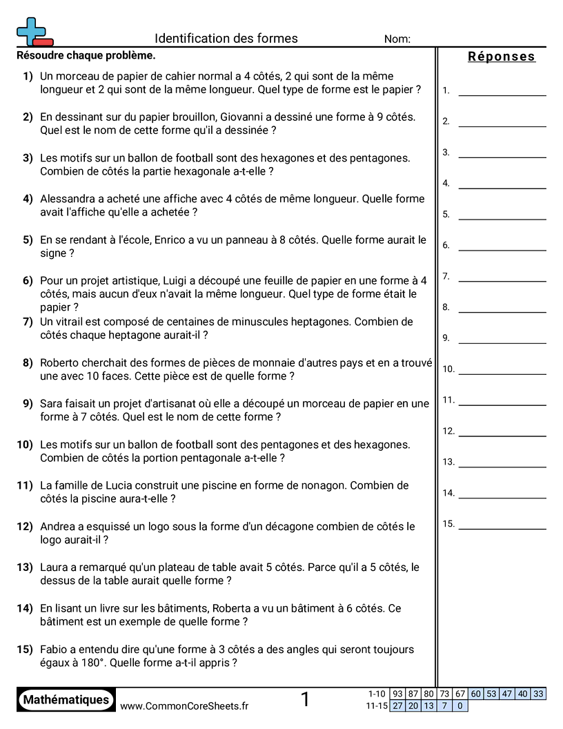 Fiches gratuites de math pour CE2 (3g1) sur Identification des formes . Chaque fiche contient 15 exercices avec corrigé et convient aux enseignants et à l'enseignement à domicile. Vous pouvez télécharger le PDF, créer des cartes mémoire ou l'utiliser pour l'apprentissage en ligne.