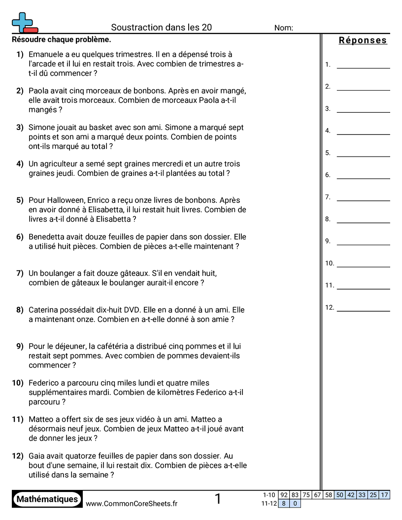 Fiches gratuites de math pour CP (1oa1) sur Soustraction dans les 20. Chaque fiche contient 12 exercices avec corrigé et convient aux enseignants et à l'enseignement à domicile. Vous pouvez télécharger le PDF, créer des cartes mémoire ou l'utiliser pour l'apprentissage en ligne.