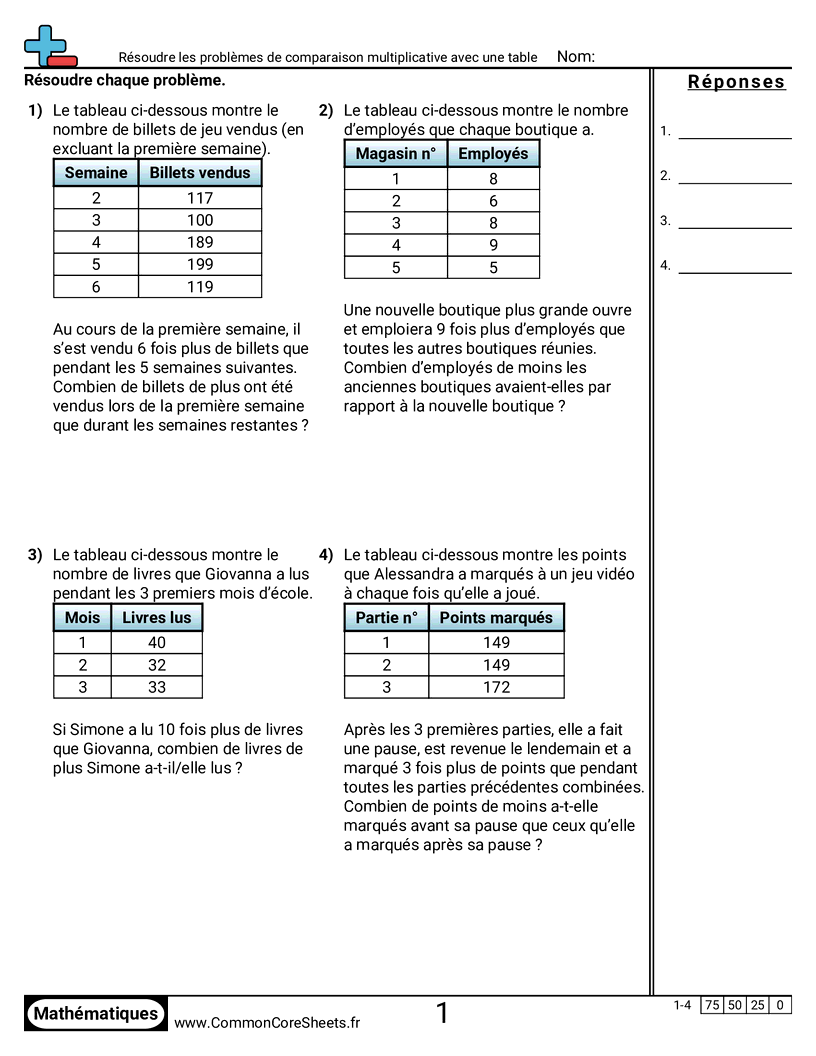 Fiches gratuites de math pour CM1 (4oa2) sur Résoudre les problèmes de comparaison multiplicative avec une table. Chaque fiche contient 4 exercices avec corrigé et convient aux enseignants et à l'enseignement à domicile. Vous pouvez télécharger le PDF, créer des cartes mémoire ou l'utiliser pour l'apprentissage en ligne.