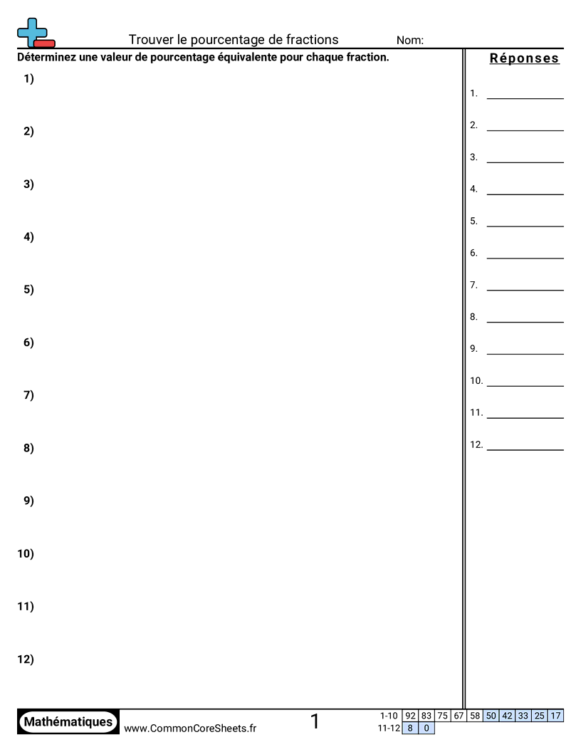 Fiches gratuites de math sur Trouver le pourcentage de fractions. Chaque fiche contient 12 exercices avec corrigé et convient aux enseignants et à l'enseignement à domicile. Vous pouvez télécharger le PDF, créer des cartes mémoire ou l'utiliser pour l'apprentissage en ligne.
