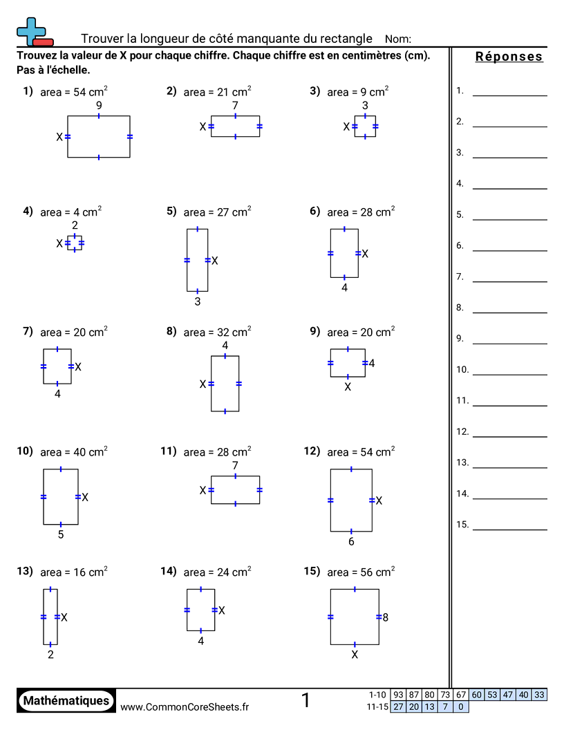 Fiches gratuites de math sur Trouver la longueur de côté manquante du rectangle. Chaque fiche contient 15 exercices avec corrigé et convient aux enseignants et à l'enseignement à domicile. Vous pouvez télécharger le PDF, créer des cartes mémoire ou l'utiliser pour l'apprentissage en ligne.
