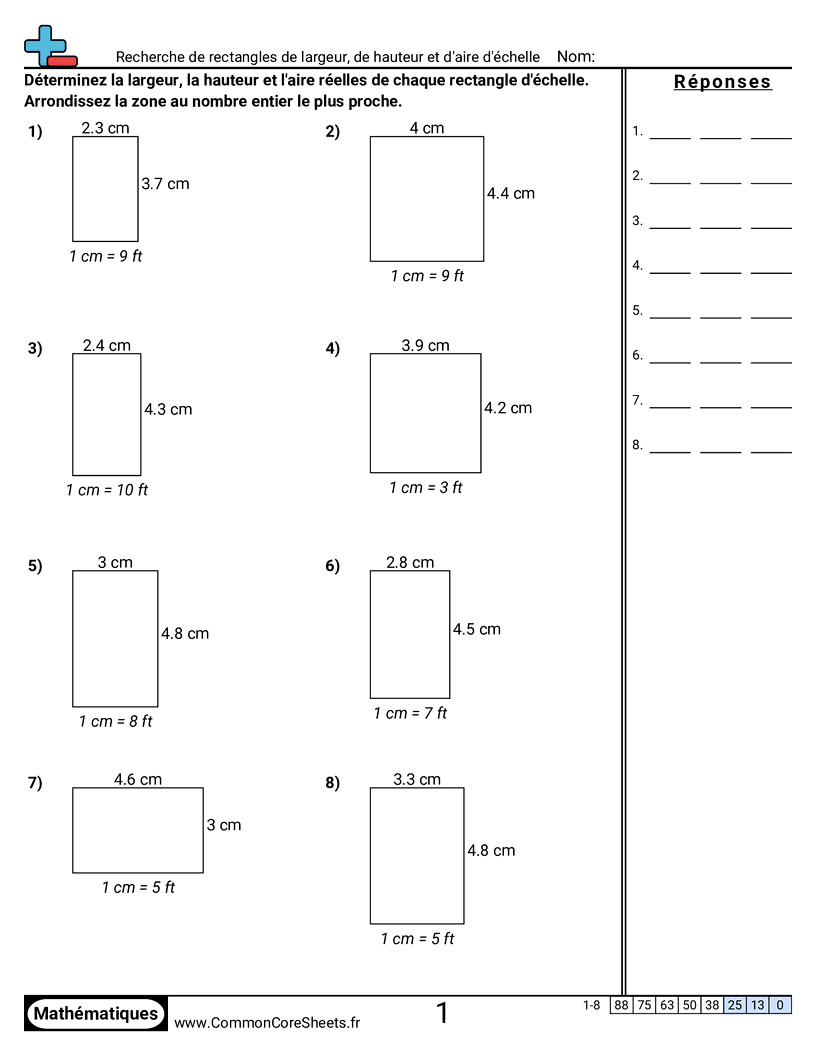 Fiches gratuites de math pour 5ème (7g1) sur Recherche de rectangles de largeur, de hauteur et d'aire d'échelle. Chaque fiche contient 8 exercices avec corrigé et convient aux enseignants et à l'enseignement à domicile. Vous pouvez télécharger le PDF, créer des cartes mémoire ou l'utiliser pour l'apprentissage en ligne.