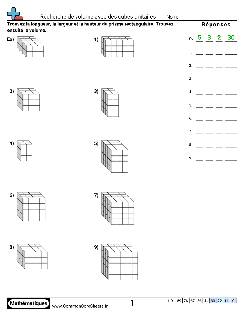Fiches gratuites de math pour CM2 (5md4) sur Recherche de volume avec des cubes unitaires . Chaque fiche contient 9 exercices avec corrigé et convient aux enseignants et à l'enseignement à domicile. Vous pouvez télécharger le PDF, créer des cartes mémoire ou l'utiliser pour l'apprentissage en ligne.